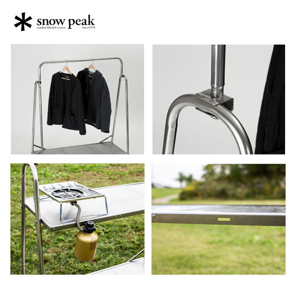 高さ調節も可能なステンレス製の天板は、ゆったりと広々としたサイズで、下ごしらえから火を使った調理まで、あらゆる作業をストレスなく行えます。別売りのパーツを用いてIGTフレームロングをセットし、天板として使用することも可能です。 またメッシュラックスタンド、ガビングスタンドにもマッチし、快適なキッチンスペースを作ることができます。 さらに、トップのバーを起こせば、ハンガーラックとしても機能。IGTフレームやマルチファンクションテーブルなどのユニットシステムを連結できる、優れた拡張性も備え、自由自在なデザインレイアウトを楽しめます。