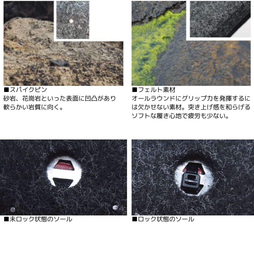 “安心・安全”“タフネス”をコンセプトに進化した「ベリピタロックシステム」。足元の安心感は全ての釣りにおいて不可欠な「快適さ」をもたらす。