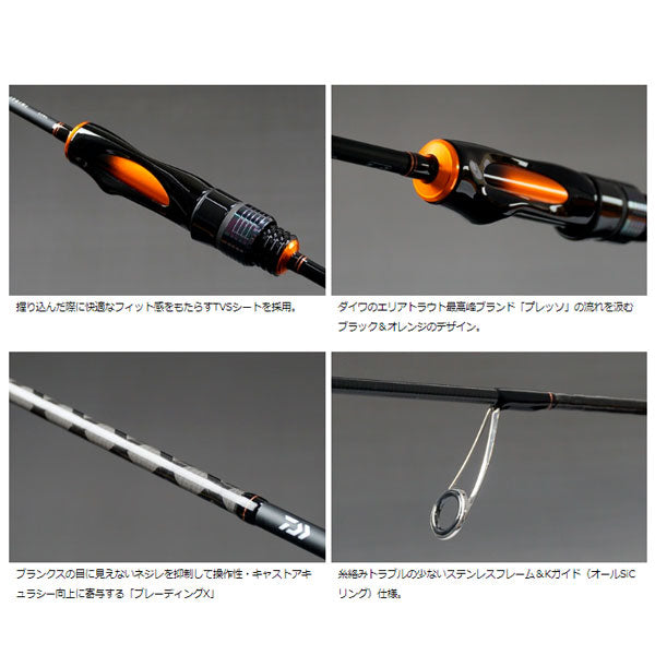 オールSiC/Kガイド・ブレーディングX搭載の本格派エリアトラウトロッド エリアトラウトをもっと楽しみたい、そんな思いから産まれたベーシックロッドシリーズ。ダイワならではの信頼に支えられたクオリティをベースに、糸絡みトラブルの少ないステンレスフレームオールSiC Kガイド、ブランクのネジレを抑える「ブレーディングX」などの優れた機能を搭載。黒のブランクに映える鮮やかなオレンジカラーはアングラーの心を高揚させてくれる。心地よいキャストフィール、小気味よくルアーの動きを伝える感度、しなやかに魚を絡め獲る乗りの良さ。エリアフィッシングを楽しむあなたの全ての動作を心地よくサポートしてくれるロッド。子供でも使いやすい5'6"/XXULアクションから、携帯に便利な4ピースモデル、大規模ポンド用の長尺版まで、全10アイテムのラインナップ。性能・デザインともに同名のスピニングリールとベストマッチ。 56XXUL-S・・・キャストしやすいソリッドティップショートロッド
