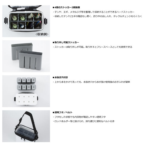 「4室のストッカーを2個装備」。船タチウオテンヤ、ボートエギ、メタルジグの収納が可能