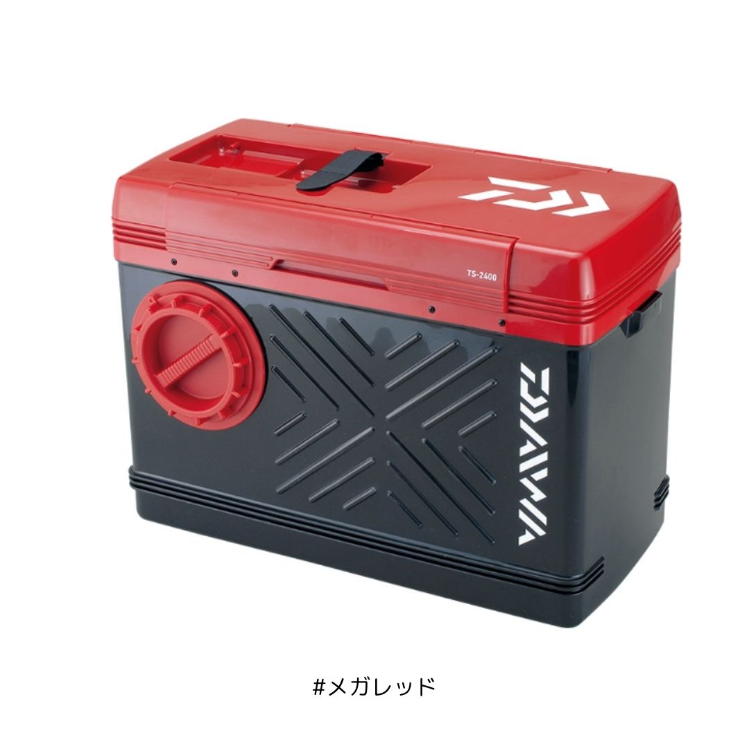 オトリが落ち着く内面ブラック仕様で、ワンタッチでジェットエアーも装着可能(ジェットエアーは別売り)。上フタの着脱が簡単なワンタッチロックと、プッシュトップ付両開き投入口を備えていて、石が滑り落ちにくい石止めリブがあり、ダイワの友舟がスッポリ収納可能(BT・BXシリーズは除く。AT・AXシリーズはTS-2400に収納可能)。標準装備のメタルストーンがワンタッチでセット可能。