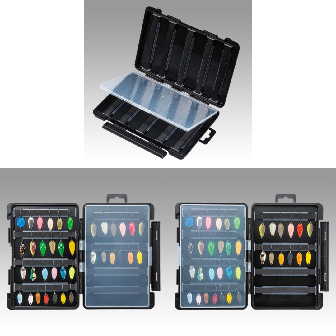 トラウトやライトゲームユーザー向けに開発した、使い勝手と収納力を両立する、観音開きの“薄型ワレット”両面収納ケース。収納部には、フォーム一体型の取替ボードを採用しているので、自在に収納構造をアレンジできます。向かい合って閉じるため、フックやスプーンが絡み合うのを防ぐパーテーションを搭載しているのでストレスなくスプーンを取り出せます。自社のあらゆるボックスにシンデレラフィットする3010サイズを採用することで、システム収納の幅が格段に広がりルアーなどの収納容量も大幅にアップします。