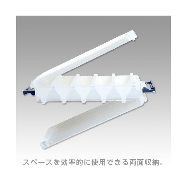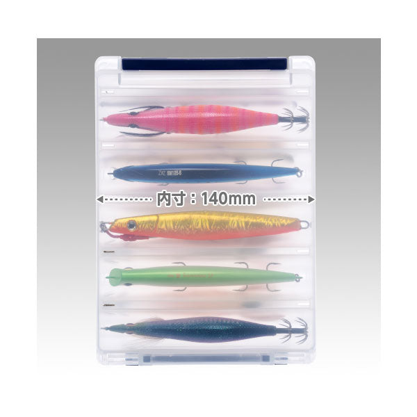 VS-3010サイズの最大収納幅、内寸140mmを確保。対面トライアングル構造の両面収納タイプによりスペースを有効利用。エギのシンカー部・ルアーのトリプルフックが溝に収まるので、無駄なスペースを解消。水抜きダクト付きで丸洗いも可能。