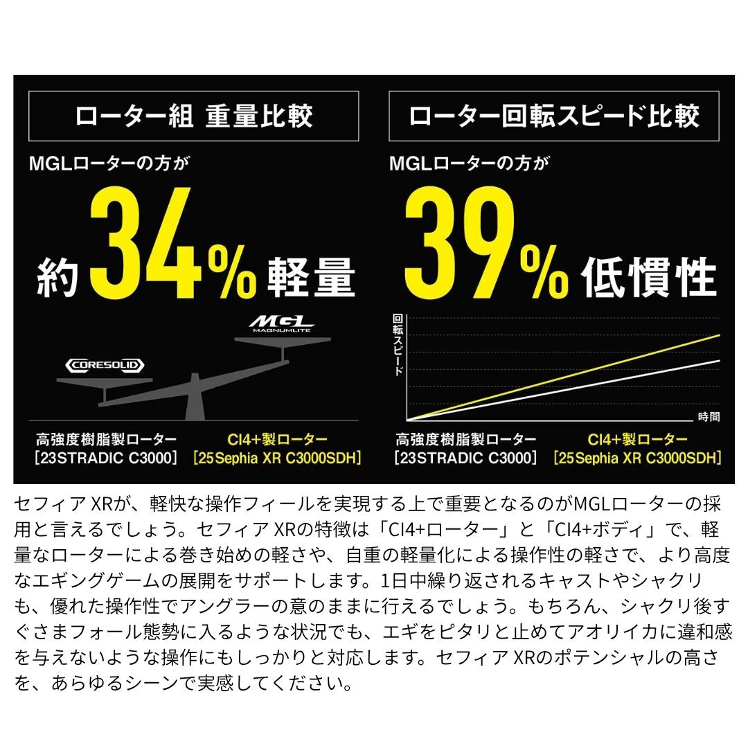 エギングゲームにおいて、リールが果たす役割は非常に大きく、また求められる性能も他の釣種とは異なる部分が多い。セフィアXRはエギを繊細にコントロールするための操作性、素早く糸フケを回収するためのレスポンス性能、C3000サイズでは大型のアオリイカとのファイトで必要なドラグ調整のしやすさやドラグの滑らかさなどを完備。さらにパワフルな巻き上げを実現したインフィニティドライブ、ギアの耐久性を向上させたインフィニティクロス、ラインローラー周りのトラブルを抑制するアンチツイストフィンの先進テクノロジーも搭載。ラインナップはライトエギングにマッチした小型軽量のC2000Sを含む全5機種。動のシャクリ、静のフォール、力のファイト、あらゆるシーンで操作する歓びを実感できる専用リールとして仕上がっています。