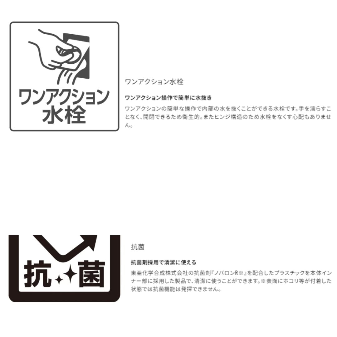 ICE値(h):55 断熱構造:発泡ポリスチレン+3面一体型真空パネル 取り外し可能フタ:○ 投入口:ー サイドロック:○ ハンドル:○ ラックアップハンドル:○ ショルダーベルト:○ 水栓:○ キャスター:○ 滑り止めゴム:○ トレー:○