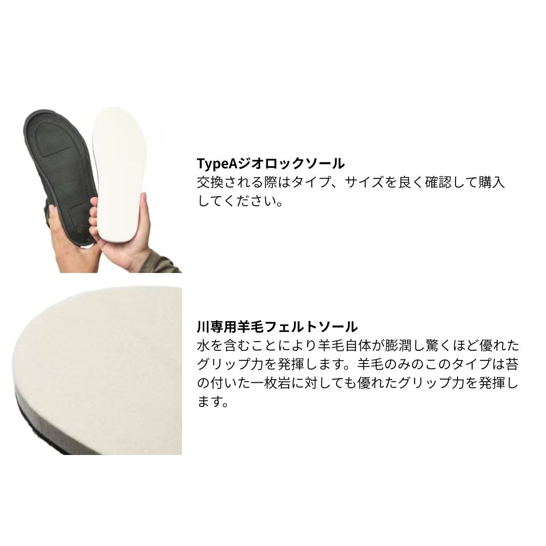 苔の付いた岩で驚くほど優れたグリップ力を発揮する羊毛フェルトが搭載されたジオロックソールキット。安全には欠かせない装備です。TypeAに対応。