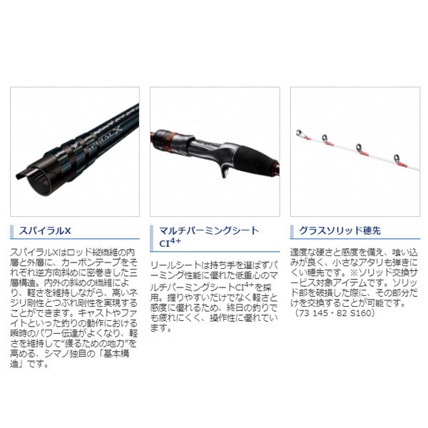 進化し続けるマルイカ釣りに対応したベイゲームマルイカはスパイラルXによる細身軽量設計のブランクスを採用することで、不快なブレやネジレを抑制。思い通りのタタキ操作や誘い操作が可能になりました。リールシートは軽量化と軽快な操作性を追求したマルチパーミングCI4+シートを採用。先鋭化した最新テクニックに対応する3アイテムが高次元のマルイカ釣りを展開します。82 S160 叩けるゼロテン & 深場アイテム。柔軟穂先にしっかりと叩ける穂持ちを持った、操作性の良い深場ゼロテンモデルです。