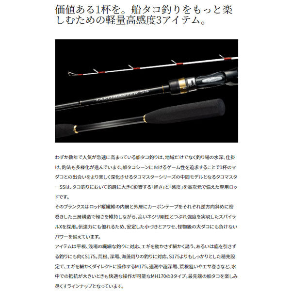 船タコ釣りはただでさえ面白い。それなら、もっと面白くしたい。たとえば一回の流しで、マダコも含めて怪しい変化を10回感じられた人と、数回も感じられない人では、釣果は別にして、釣りの満足感はきっと違うはず。もしそれが海藻でも、石でも、手に触れたようにときめき、アワセては笑う。そして本物のタコを乗せた瞬間に、すべてを忘れるほど興奮する。船タコ釣りの楽しさ、ゲーム性を追求しマスターするタコマスターシリーズに、新たに加わるタコマスターSSは、そんな釣り人の歓びを誰もが共有できるロッドです。スパイラルX構造を採用した軽量設計のブランクスは、タコエギを軽快に小突くシャープな操作性と、怪物級の大ダコに対しても負けない強靭なバットパワーを両立。グラスソリッド穂先は粘りと反発の絶妙なバランスにより感度と乗せ性能に加え、心地よさまで追求。釣りをしている間は常に手の触れるリールシートは軽量化と細かな操作性を追及したマルチパーミングCI4+シートを搭載。手に馴染み、小突きが楽しくなる軽量高感度エギタコロッドに仕上がっています。アイテムは最新の船タコシーンに対応すべくS175・M175・MH170をラインナップ。フィールドにより、釣法により、好みにより、より満足のいくロッドセレクトを可能にしました。