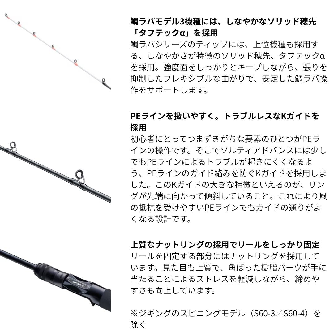 ターゲットやフィールド、そして釣り方に合わせて多様化するオフショアゲーム。ソルティーアドバンスシリーズは、オフショアゲームのトレンドに充実のラインナップで対応します。定番のタイラバゲームにはタフテックαやスパイラルガイドを採用した3モデルをラインナップ。等速巻きなどより高度な要求にもしっかりと応える仕様となっています。また、ジギングはSLJ(スーパーライトジギング)、LJ(ライトジギング)、ジギングと扱うジグに応じて3カテゴリー7モデルで対応。上位モデルの開発で培ったノウハウを投入することで、高いパフォーマンスを発揮しながら扱いやすい特性を実現。これからオフショアゲームを始めたいアングラーにもピッタリのシリーズとなっています。