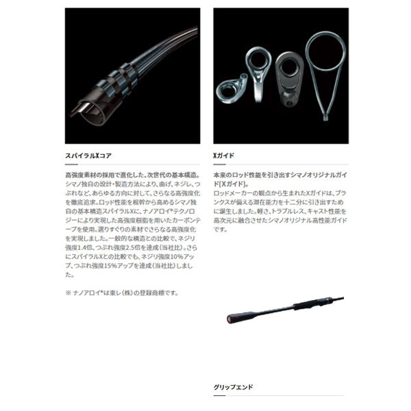 ティップエギングロッドに求められる基本性能を徹底的に磨き上げたのがエクスチューン。自重の軽さのみならず、使用時に軽快と感じる"真の軽さ"を追求。軽く、細く、シャープに、そしてエクスチューンならではの「粘り」を付加。力強いシャクリでも安定感を与え、大物とのファイトでも安心感をもたらします。基本構造[スパイラルXコア]は軽くて強いブランクスを実現。[カーボンモノコックグリップ]は、その中空・軽量・硬質な構造により振動伝達性が高く、水中のあらゆる情報が手に響きわたる。[Xガイド]は軽量性に優れ、ライントラブルや空気抵抗を大幅抑制。そしてティップ部には[タフテック∞]を採用し扱いやすさはもちろん微細なアタリを捉える目感度も両立。とことんこだわった仕上がりをあなた自身で体感ください。
