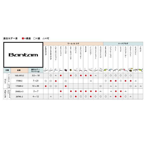 1ピースと変わらない機能と信頼性を持たせたBantam 2ピースは、 利便性を追求しながらも、その使用感はいつもと変わらぬBantamそのもの。 旅先のほんのわずかの時間でもバスフィッシングがしたい。 そのためにはクオリティの高い、選りすぐりの一本が欲しい。 そんなアングラーの願いに応える本格2ピースを、Bantamから。