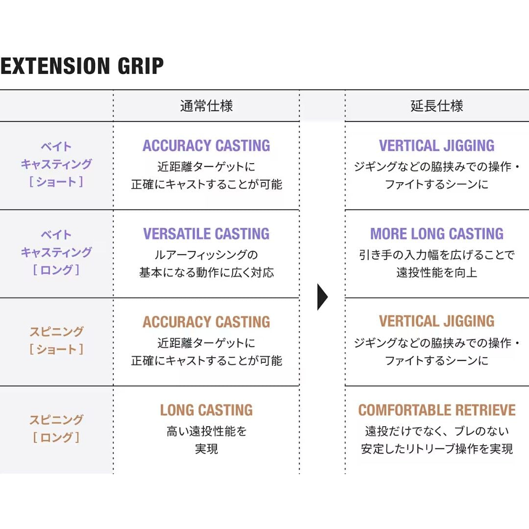 ライトルアーのアキュラシーキャストに特化。ピッチング主体のシャローエリアのジグ&ワームや、港湾のボートシーバスにも対応。付属のエクステンショングリップ装着でライトジギングまでこなす。