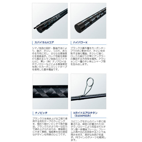軽さと強さを高次元でバランスさせた、シマノ・サーフルアーロッドのハイスペックモデル。小型ミノーから、ヘビーウエイトジグまで1本でこなす汎用性の高さが特長で、複数本のロッドを持ち歩けないサーフゲームにおいて、大きなアドバンテージとなる幅広い対応力を追求しました。進化した基本構造、スパイラルXコアとハイパワーXを搭載することにより、キャストやファイト時におけるネジレを抑え込み、ブランクスがもつ本来の性能をフルに発揮することが可能になりました。不意に訪れるランカーサイズとのファイトでも、相手に主導権を与えないスピーディなファイトをサポートします。また、カーボンモノコックグリップを搭載することにより大幅な軽量化と高感度化を達成。シマノの最新技術を惜しむことなく投入することで獲得した粘りと強さで、アングラーに安心感を与える高性能サーフロッドが誕生しました。 S106MH パワーとレングス、両方を求めるアングラーのためのロッド。50gを超えるルアーも楽に扱え、パワーとレングスを活かせば超遠投も可能。ヒラメをはじめ、ブリや大型マダイ、オオニベなどの大型魚狙いにもマッチします。特筆すべきは、その操作性。ガチガチの調子ではなく、ゴツイ仕様やデザインでもありません。あくまで曲がりはスムーズ。重量級ルアーでも軽やかな操作が可能です。長時間の釣りでも疲れにくく、ワンランク太いラインでのショアジギングまでこなせます。また消波ブロックや沈み根、急角度のブレイクライン周辺を素早くクリアするためのパワーファイトも得意。ヒラメゲームだけでなく、フルシーズン、サーフにおける大型魚の攻略に活躍するアイテムです。
