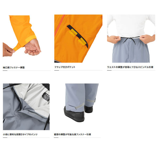 上質な生地質感、ハイコスパ・レインスーツ 生地質感にこだわって作られた、コストパフォーマンスの高いストレッチレインスーツです。雨の釣行時に求められる基本的な性能を備えているだけでなく、ジャケットはドローコード、パンツは面ファスナーで裾部分のフィット感の調整が簡単に行えるようになっています。