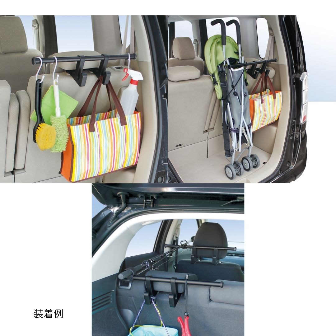 ●ヘッドレストに取り付けていろいろな使い方ができる便利なマルチバー&フック。