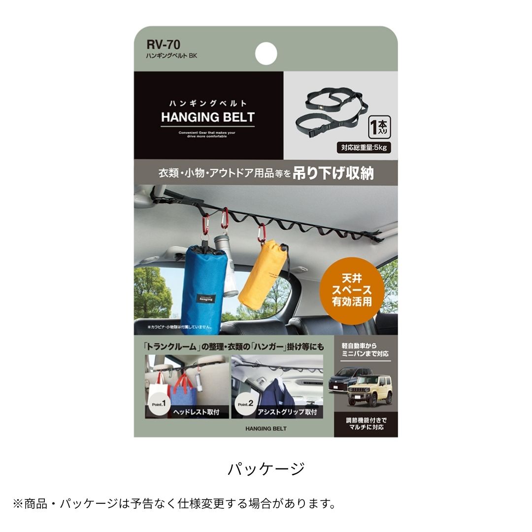 ●アシストグリップやヘッドレストポールに取り付けて、衣類や小物を吊り下げることができる便利な収納ベルト。