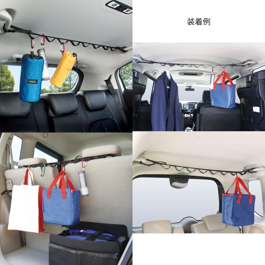 ●天井や後部座席スペースを活かす便利な吊り下げ収納ベルト。