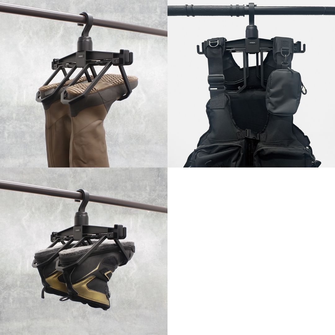 ●洗ったウェーダーや磯靴、長靴等のサイズの靴等を逆さまに干すことができる高剛性のハンガーです。