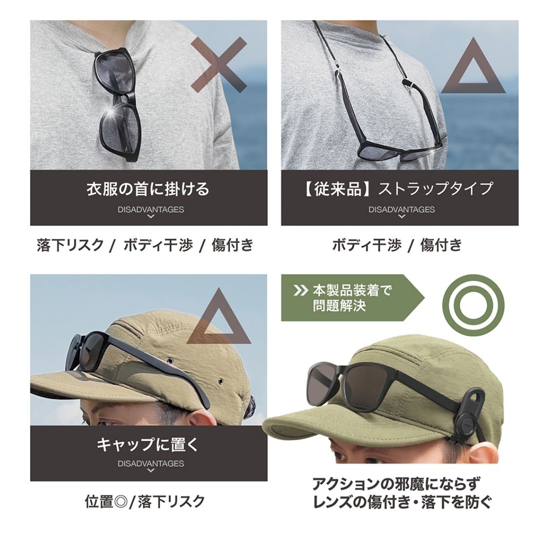 ●サングラスの落下防止・傷付き軽減に便利なキャップ用サングラスホルダーです。