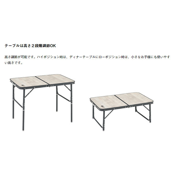 アウトドア+おうちでも使えるダイニングテーブル!幅約90cmで広々と食事を楽しめるダイニングテーブル。高さ2段階調節に対応しており、ローポジション時なら小さなお子様でも使いやすい。収納時はパタンと折りたたんで薄型になるため、運搬や保管の際にも場所をとらないのもポイント。フレームはアルミ製。●高さ2WAY