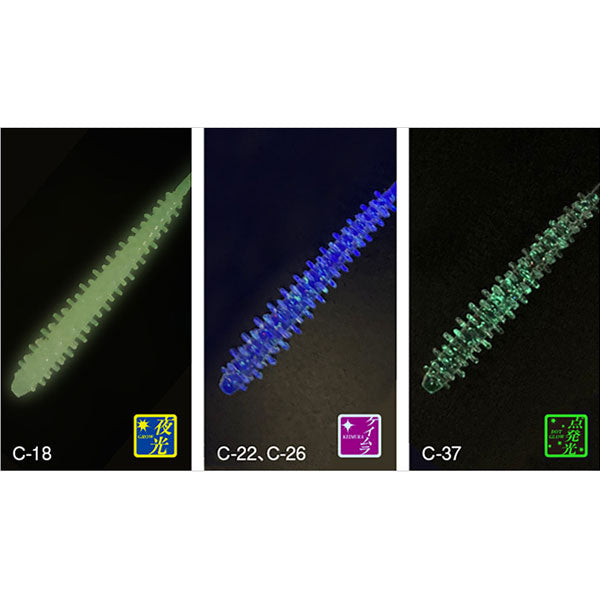 リングでもなくリブでもない、水をつかみやすい松ぼっくりのようなカサ状ボディが、軽いジグヘッドでも操作感をUPさせ、 独自の波動を生み出す。また、超極細のピンテールはわずかな水流でもピリピリっと機敏に動き、魚の本能へとアピール。 空気をまといやすく水平に近い姿勢をキープしやすいため、迷わず魚もパクっとバイト!!気がつけば大漁?なんてことも?!まさにアジをボッコするためのワームなのです!!