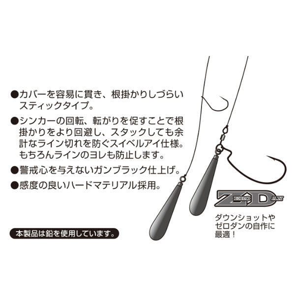 2022年、さらなる遠投・ディープ・ヘビーカバーに対応する14g~28gのヘビーウェイトを追加。●他よりも根掛り回避性能に長けるスティックタイプ。●簡単には切れず、アイがフレキシブルで、多用途なスイベルアイ採用。●オープンスイベルとの併用でZDシステムが作成可能。●感度の良いハードマテリアル採用。●目立たないガンブラック仕上げ。