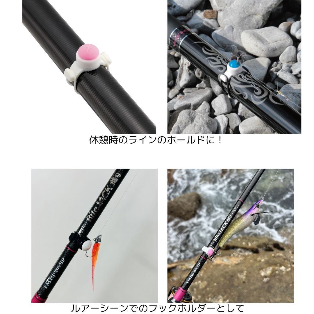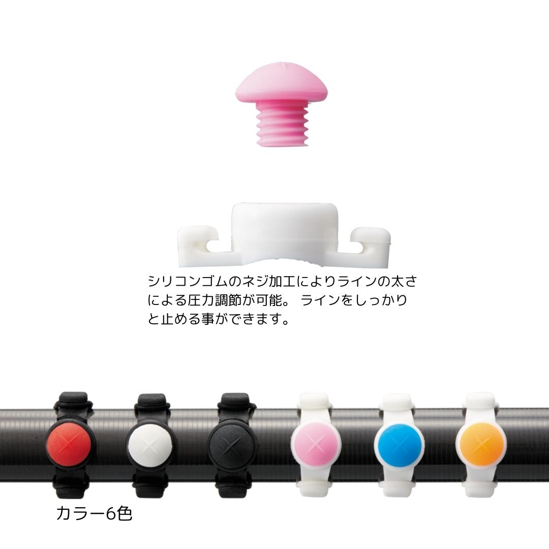 細身のルアーロッドから鮎竿まで、簡単取付でラインも針もしっかりホールド! シリコンゴムにネジ加工を施しラインの挟み込み部に圧力を掛けることでナイロン・フロロ・PEライン、細糸から太糸までしっかり掴みます。また針先を刺すことで釣針もホールド。移動時や天井糸調整、ライン切れ時などいろいろな場面で大活躍します。