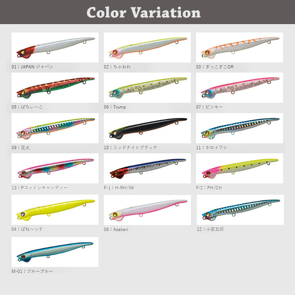 105に比べ、少しクイックで小刻みな蛇行アクションです。水深0~20cm弱を目安に使用できます。ウェイトは小さく軽い分、浮き上がりが早く、「止水域や湾奥などでのバチ抜けの時期」に特に力を発揮してくれるモデルです。地域にもよりますが、6月初旬頃の小さなカタクチイワシが接岸する時期や9月初旬頃の20cm未満のクイックなサヨリを捕食している時には、95が圧倒的有利に活躍してくれます。また、105に比べ、軽量ではありますが、飛距離に大きな差はなく、キャスト時にストレスを感じる事なく使用して頂けます。