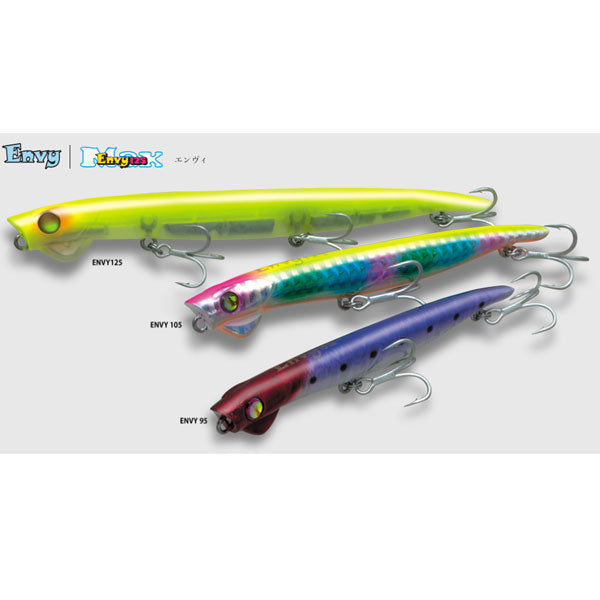 Envy95 105に比べ、少しクイックで小刻みな蛇行アクションです。水深0〜20cm弱を目安に使用できます。ウェイトは小さく軽い分、浮き上がりが早く、「止水域や湾奥などでのバチ抜けの時期」に特に力を発揮してくれるモデルです。地域にもよりますが、6月初旬頃の小さなカタクチイワシが接岸する時期や9月初旬頃の20cm未満のクイックなサヨリを捕食している時には、95が圧倒的有利に活躍してくれます。また、105に比べ、軽量ではありますが、飛距離に大きな差はなく、キャスト時にストレスを感じる事なく使用して頂けます。